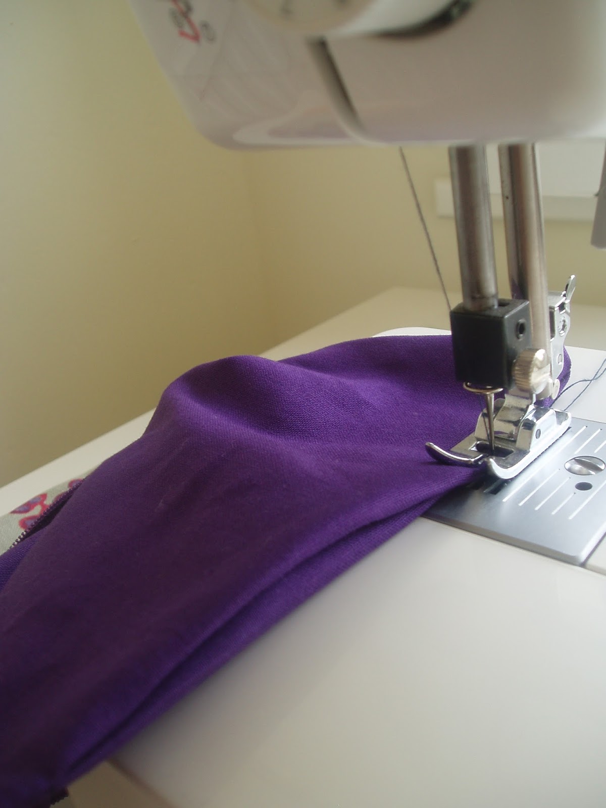 Then lay: a)the outer fabric right side up, b)a zip across the top edge of the pouch facing down and c)the lining material, right side down, on top of the zip. Pin together.
